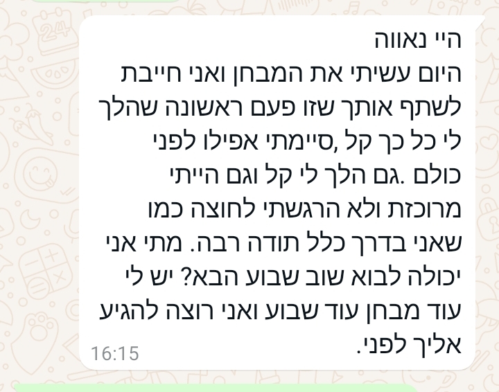היום עשיתי את המבחן ואני חייבת לשתף אותך שזו הפעם הראשונה שהלך לי כל כך קל וסיימתי אפילו לפני כולם. גם הלך לי קל וגם הייתי מרוכזת ולא הרגשתי לחוצה כמו שאני בדרך כלל תודה רבה. מתי אני יכולה לבוא שבוע הבא? יש לי עוד מבחן עוד שבוע ואני רוצה להגיע לפניו.