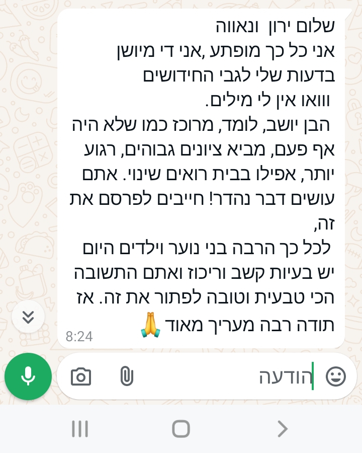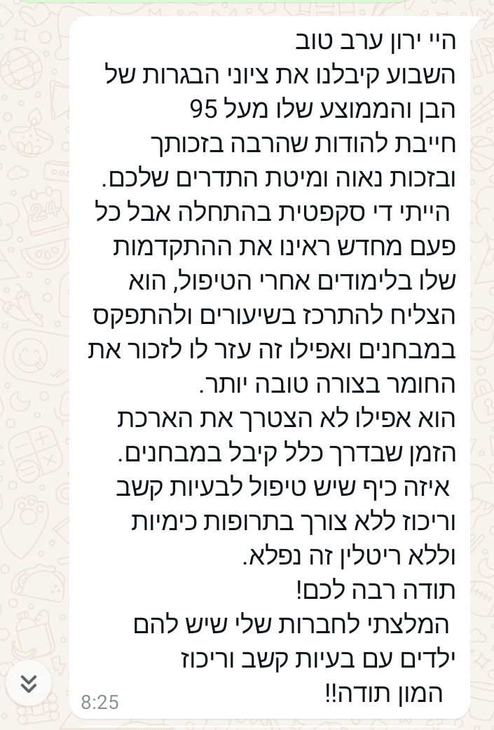 הבן יושב, לומד, מרוכז כמו שלא היה אף פעם, מביא ציונים גבוהים,רגוע יותר, אפילו רואים שינויי. למרות שעדיין החדר שלו לא מסודר כל כך, אבל אתם עושים דבר נהדר! חיבים לפרסם את זה, לכל כך הרבה בני נוער וילדים היום יש בעיות קשב וריכוז ואתם התשובה הטבעית והטובה לפתור את זה. אז תודה רבה מעריך מאוד
